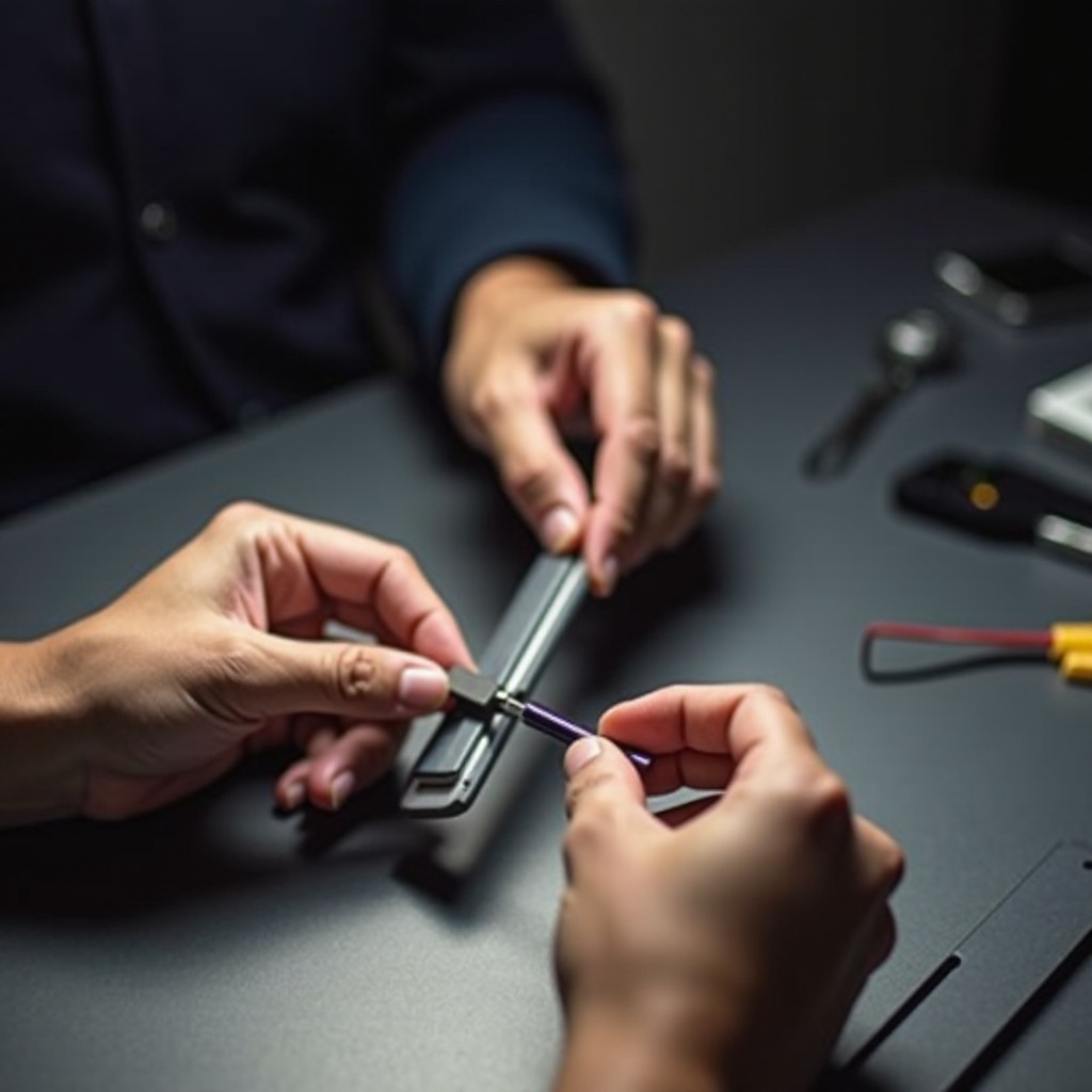 - ‘Angemessene Werkzeuge sicher verwenden’: Rüsten Sie sich mit den richtigen Werkzeugen aus, wie einem Plastikspachtel oder einem kleinen Schraubendreher. Metallgegenstände könnten zu Kurzschlüssen führen; daher wird ein nichtmetallischer Ansatz empfohlen.